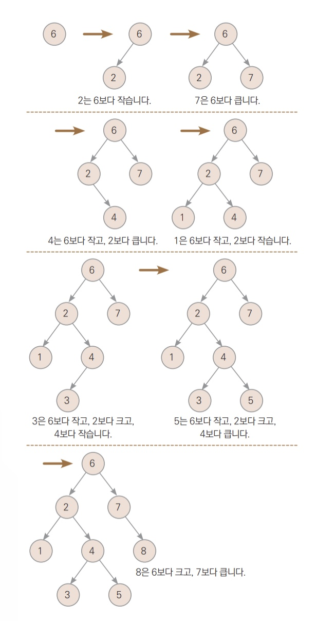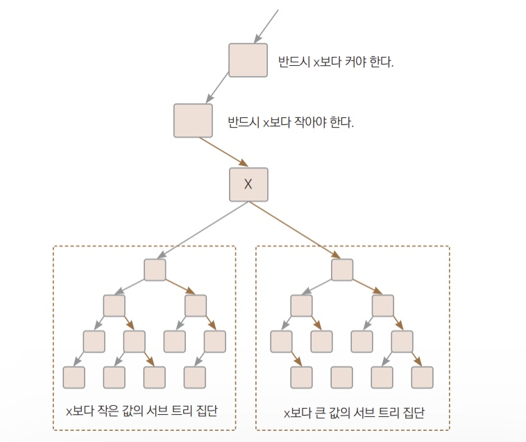 따라서 어떤 특정 값을 찾으려 할 때 한 노드와 비교해 배교한 노드보다 작은 값이면 왼쪽 자식 노드 방향으로, 그렇지 않으면 오른쪽 자식 노드 방향으로 이동한다. 따라서 비교 범위가 평균 2분의 1만큼씩 줄어들어 효과적으로 자료를 거색할 수 있다.
