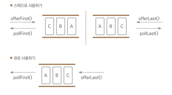 다만 Deque를 이용하면 메서드를 사용하는 방법에 따라 자료구조를 큐처럼 사용할 수도 있고, 스택처럼 사용할 수도 있다.