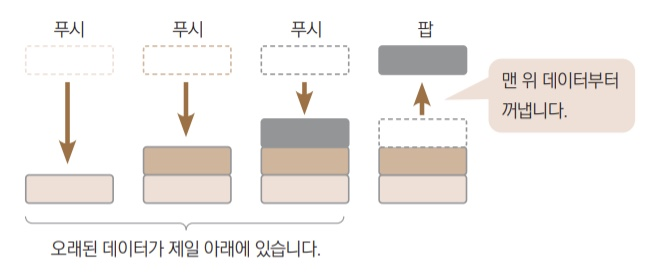 스택은 한 쪽 끝에서만 자료를 넣거나 뺄 수 있는 선형구조(LIFO, Last In First Out)로 되어있다. 자료를 넣는 것을 '밀어 넣는다'라 하여 푸시(push)라고 하고 반대로 넣어둔 자료를 꺼내는 것을 팝(pop)이라고 한다.