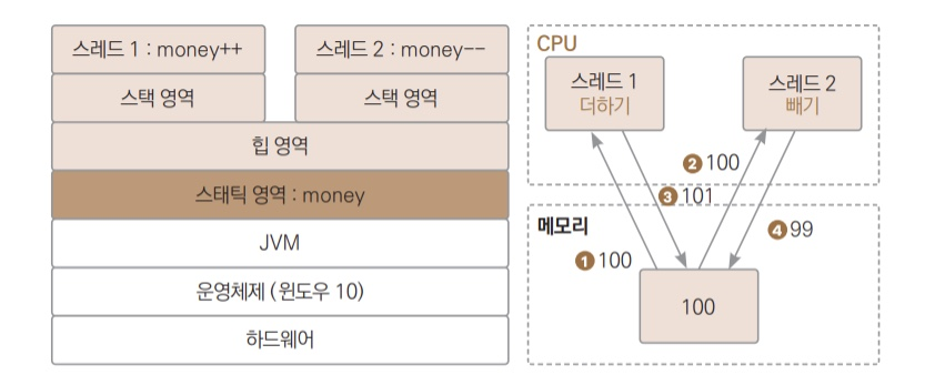 변수의 값은 메모리에 있다. 이 변수의 값을 증감하는 연산을 하려면 CPU로 값을 옮겨와서 값을 증감시키는 연산을 수행하고 나서 다시 메모리에 저장시켜야 한다. 이런 과정이 있기 때문에 여러 스레드가 같은 변수의 값을 증감시키는 연산을 수행하면 문제가 발생한다.