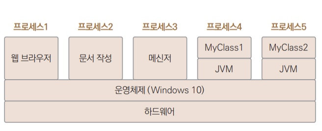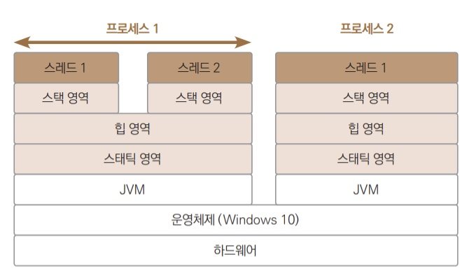 자바 애플리케이션은 JVM 위에서 동작하며, 하나의 JVM은 하나의 애플리케이션을 실행할 수 있다. 이 애플리케이션 안에서 앞에서 설명한 웹 브라우저처럼 여러 작업을 동시에 수행할 수 있는 데 이걸 스레드라고 한다.