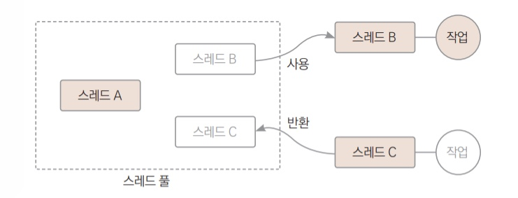 스레드 개수가 많아지면 스레드 객체 생성과 소멸, 스케줄링 등에 CPU와 메모리에 많은 부하가 발생한다. 스레드의 생성과 소멸은 리소스 소모가 많은 작업이다. 웹 서버처럼 소규모의 많은 요청이 들어올 때마다 스레드를 생성 및 종료하면 오베헤드가 발생한다. 거기에 생성되느 ㄴ스레드 개수에 제한이 없다면 OutOfMemoryError가 발생할 수 있다.