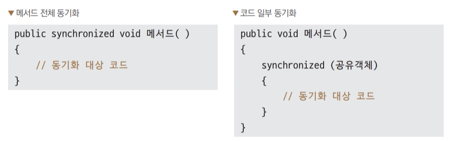 자바에서는 스레드 동기화를 사용하여 이런 문제를 해결한다. 동기화 시키는 방법은 두 가지이다.