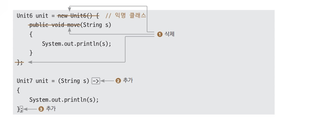 이런 불편함을 덜기 위해 자바 8부터는 함수형 프로그래밍 기법인 람다식을 지원한다. 자바는 익명 내부 클래스를 람다식으로 표현해 함수형 프로그래밍을 지원한다.