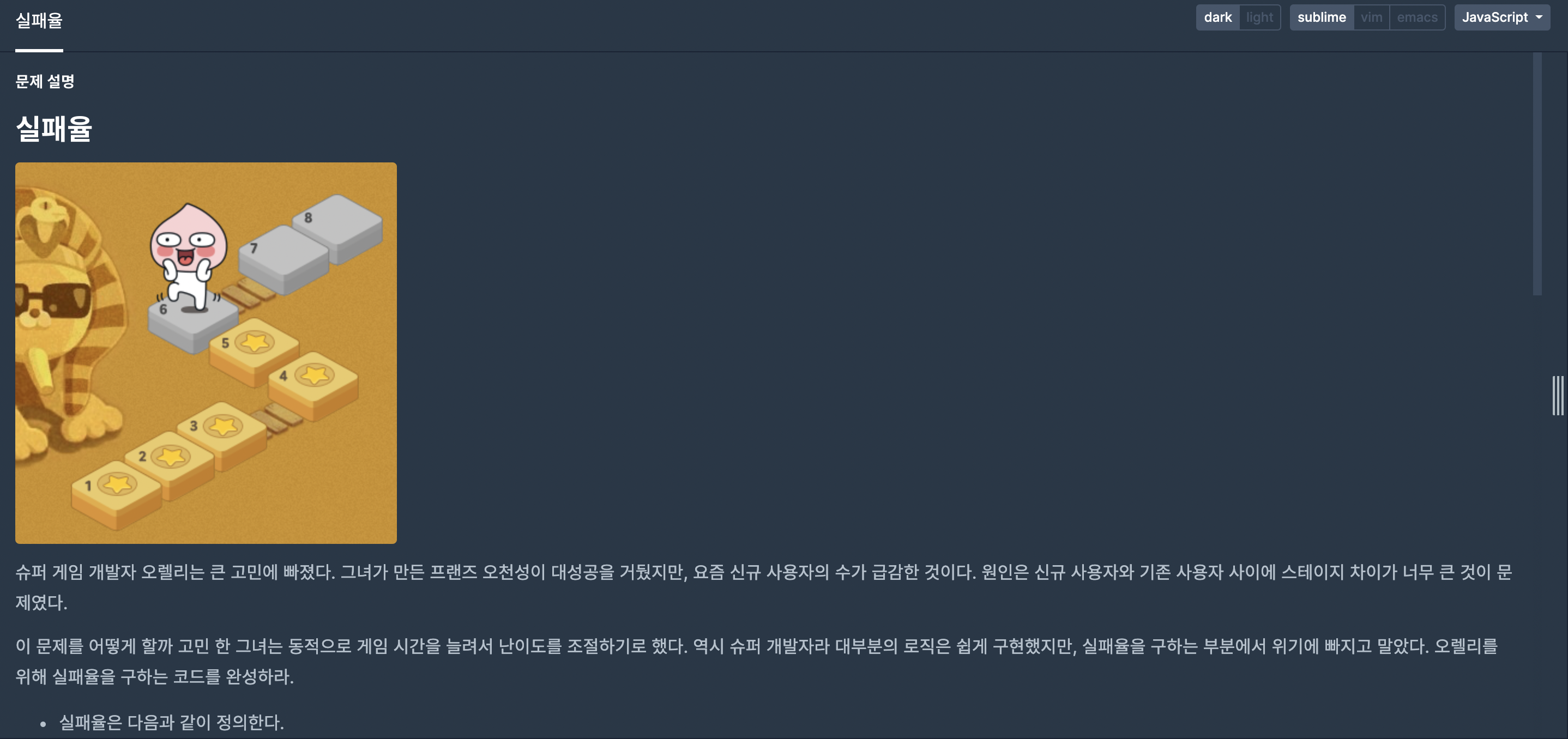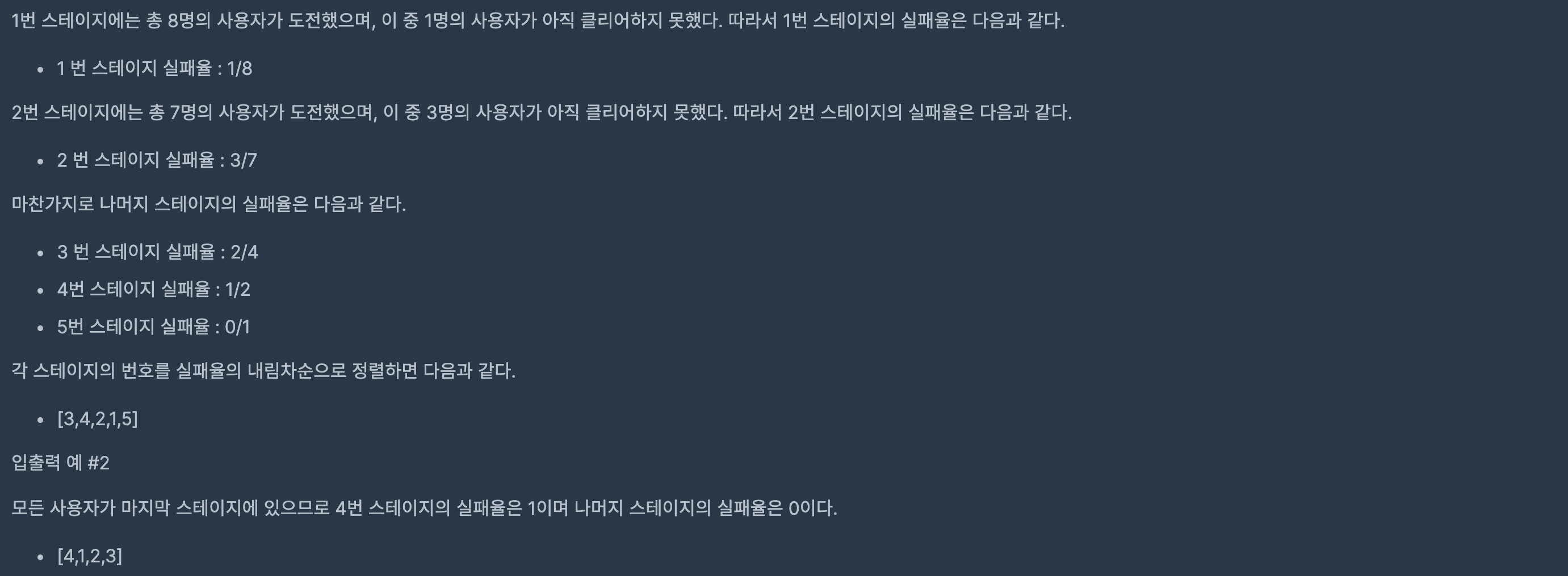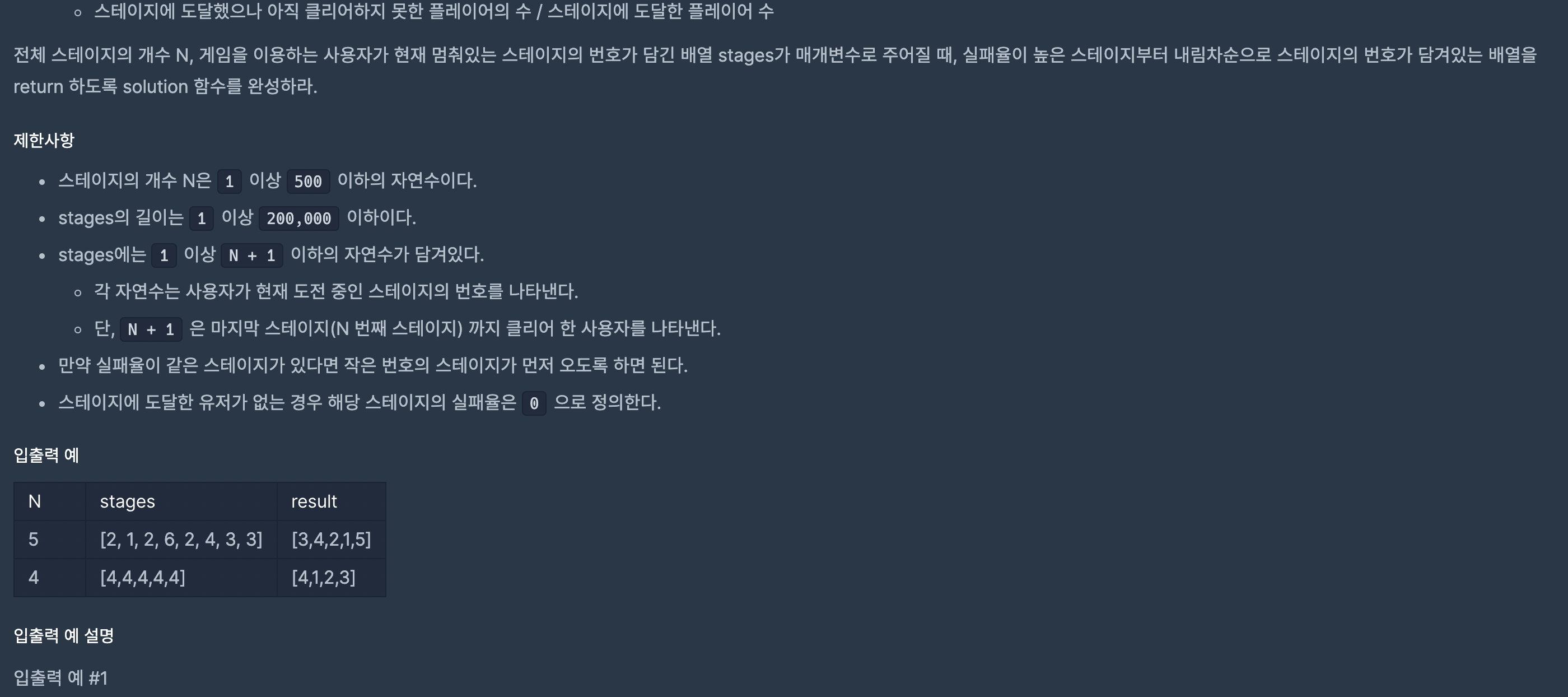 실패율 ➡️ (stages 배열 내 i의 갯수 / stages 배열 내 i 이상의 수의 갯수)