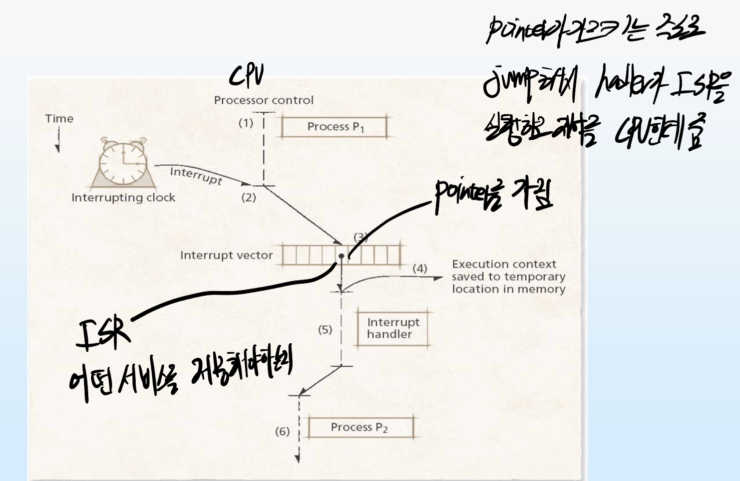 P1 실행중 clock interupt가 발생하면 ivt에 가서 해당 interupt 정보(어떤 서비스를 제공하는지)를 찾고 거기에 저장되있는 포인터를 통해 해당 주소로 이동한다. handler가 isr을 살행하고 제어를 cpu에게 넘겨준다.