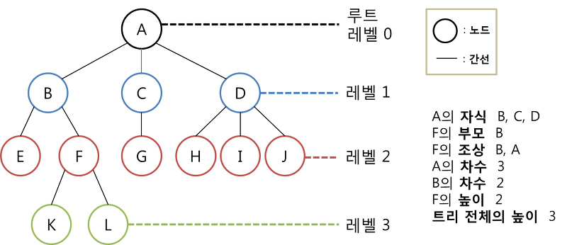 트리의 높이는 루트 노드에서 가장 높은 레벨의 노드까지이다. 위 트리의 높이는 3이다.