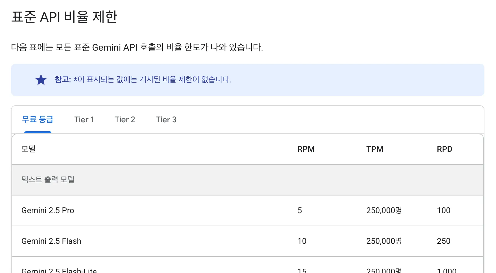 Github Actions 등록 시 LLM API가 필요하다. LLM으로 Gemini를 사용하였고, Gemini API는 Google AI Studio에서 쉽게 발급 받을 수 있다. Gemini를 사용한 이유는 한도 내에서 충분히 사용 가능할 것이라 생각해서다. 모델 별 Rate limit은 공식 문서에서 자세히 확인할 수 있다.