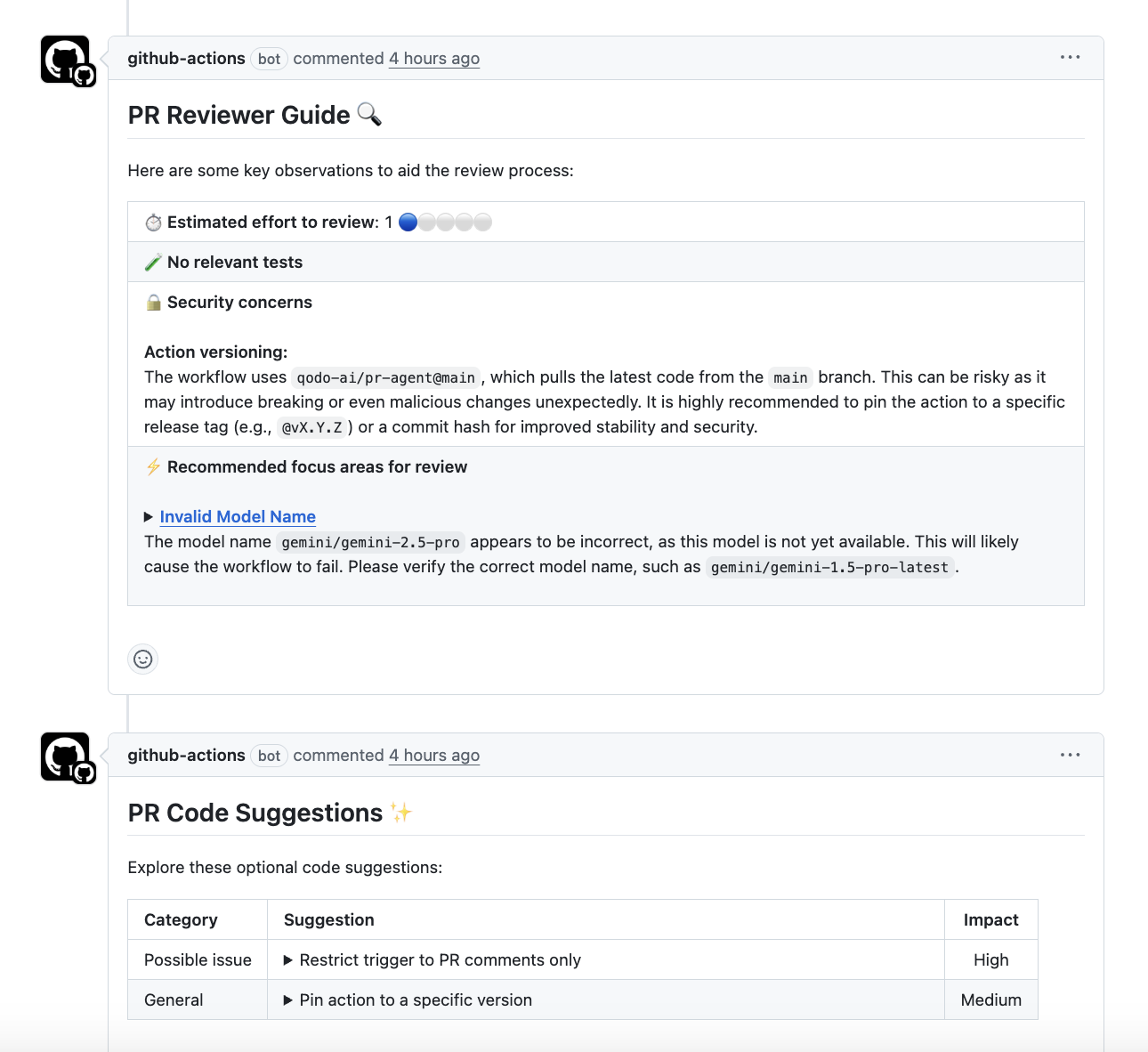 이처럼 구성하고 PR을 생성하면 다음과 같이 리뷰가 생성되는 것을 확인할 수 있다.