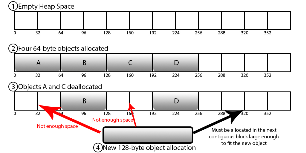 메모리 파편화는 물리적 메모리에 존재하는 실제 여유 공간보다 적은 양으로 인식되게 만들 수 있으며, 결과적으로 프로세스가 필요한 메모리를 확보하지 못하고 종료되는 문제를 일으킬 수 있다.