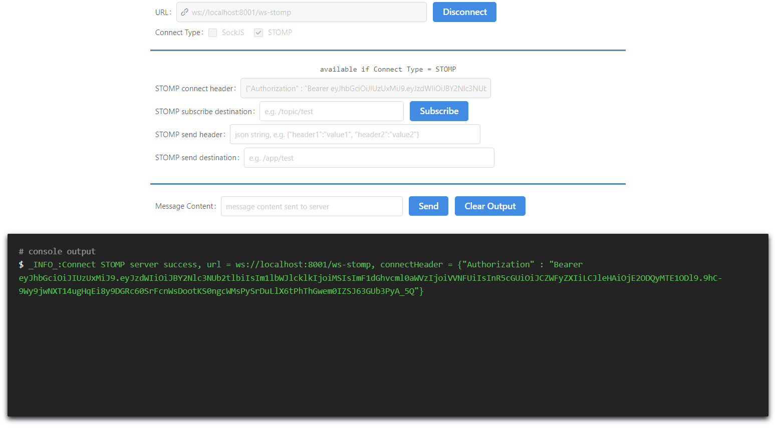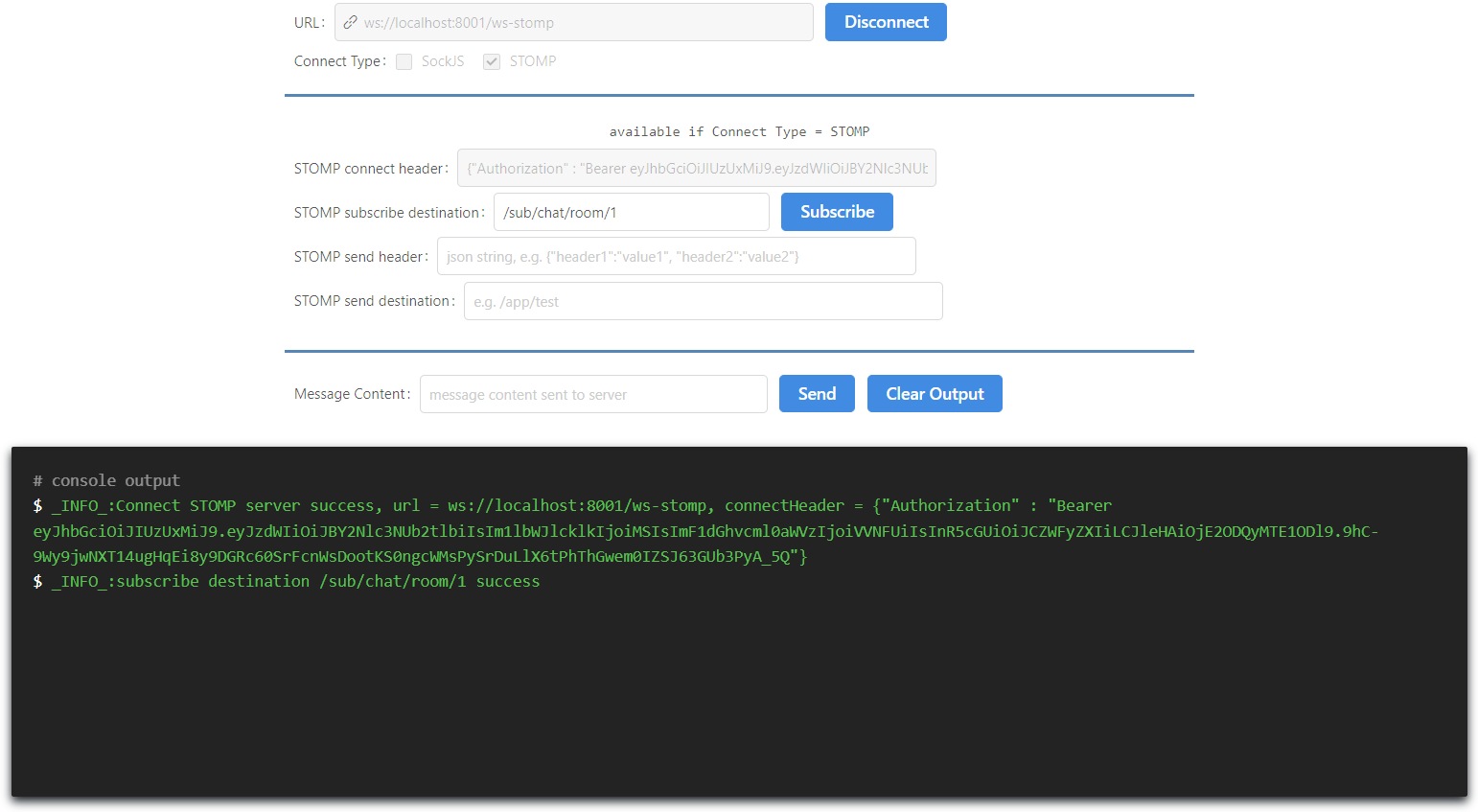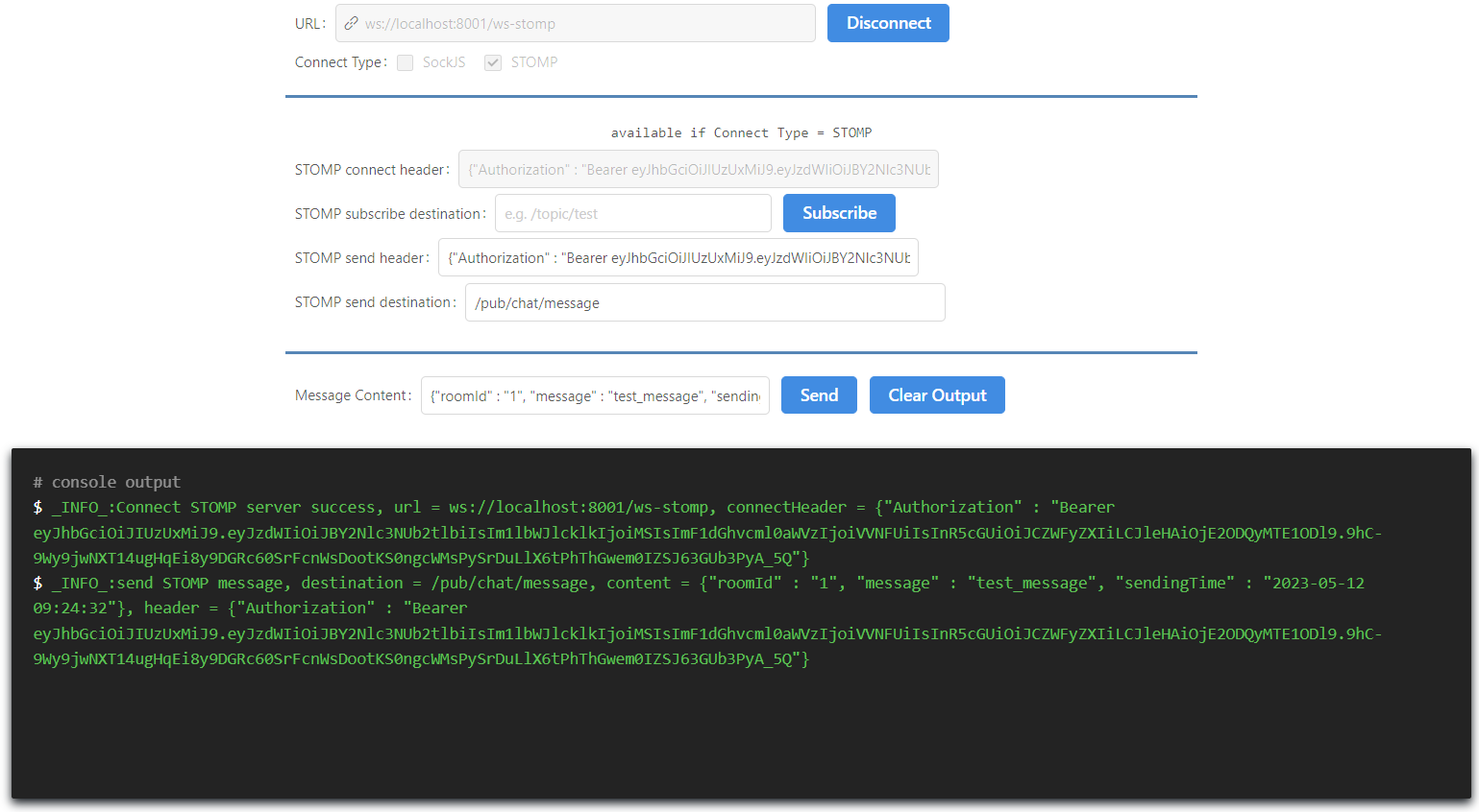 Postman은 STOMP 테스트를 지원하지 않는다. 따라서 apic을 사용하여 STOMP를 테스트 했다. apic의 문제점은 STOMP connect 할 땐 header에 token 넣지만, message를 send 할 땐 header에 값을 추가할 수 없다. 지금까지 구현한 로직은 메세지를 보낼 때 마다 메세지 헤더에 있는 token이 유효한지 확인하기 때문에 apic으로 테스트하기엔 적합하지 않다. 따라서 다른 테스트 툴을 찾았다. 해당 툴은 header에 값을 추가하여 보낼 수 있어 성공적으로 테스트할 수 있었다.