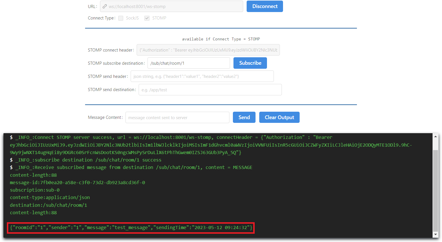 STOMP subscribe destination에는 messagingTemplate.convertAndSend에 작성한 경로, 그리고 채팅방 순으로 입력한다. Subscribe를 눌렀을 때 아래와 같이 나오면 성공적으로 구독한 것이다. 테스트에서는 1번 채팅방을 구독했다.