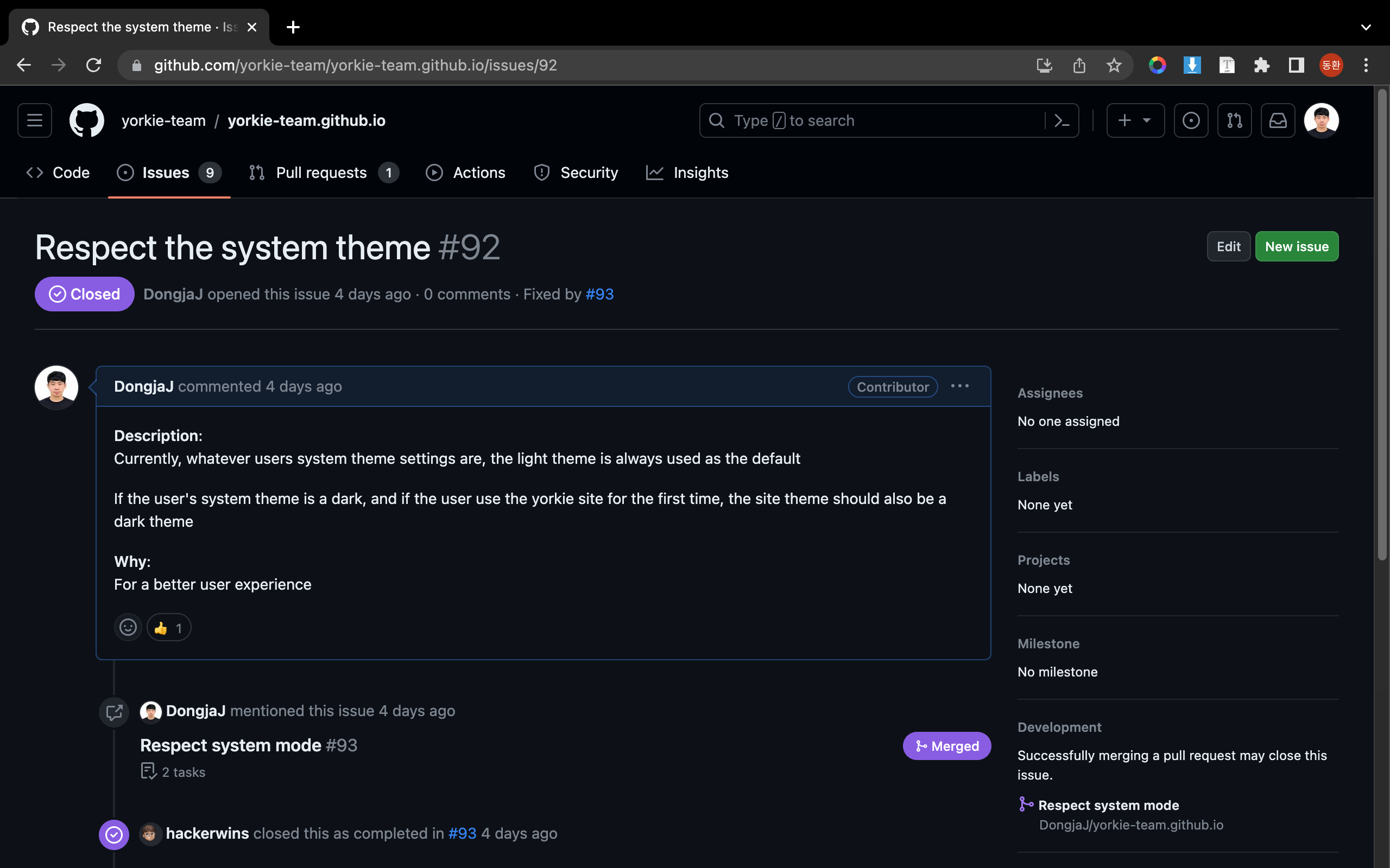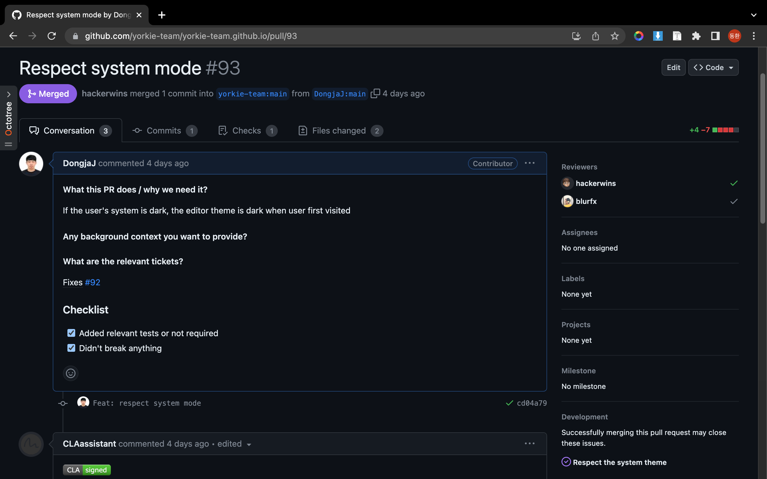 코드는 몇 줄 안적었지만 처음 오픈소스 기여에 성공해서 뿌듯했다.