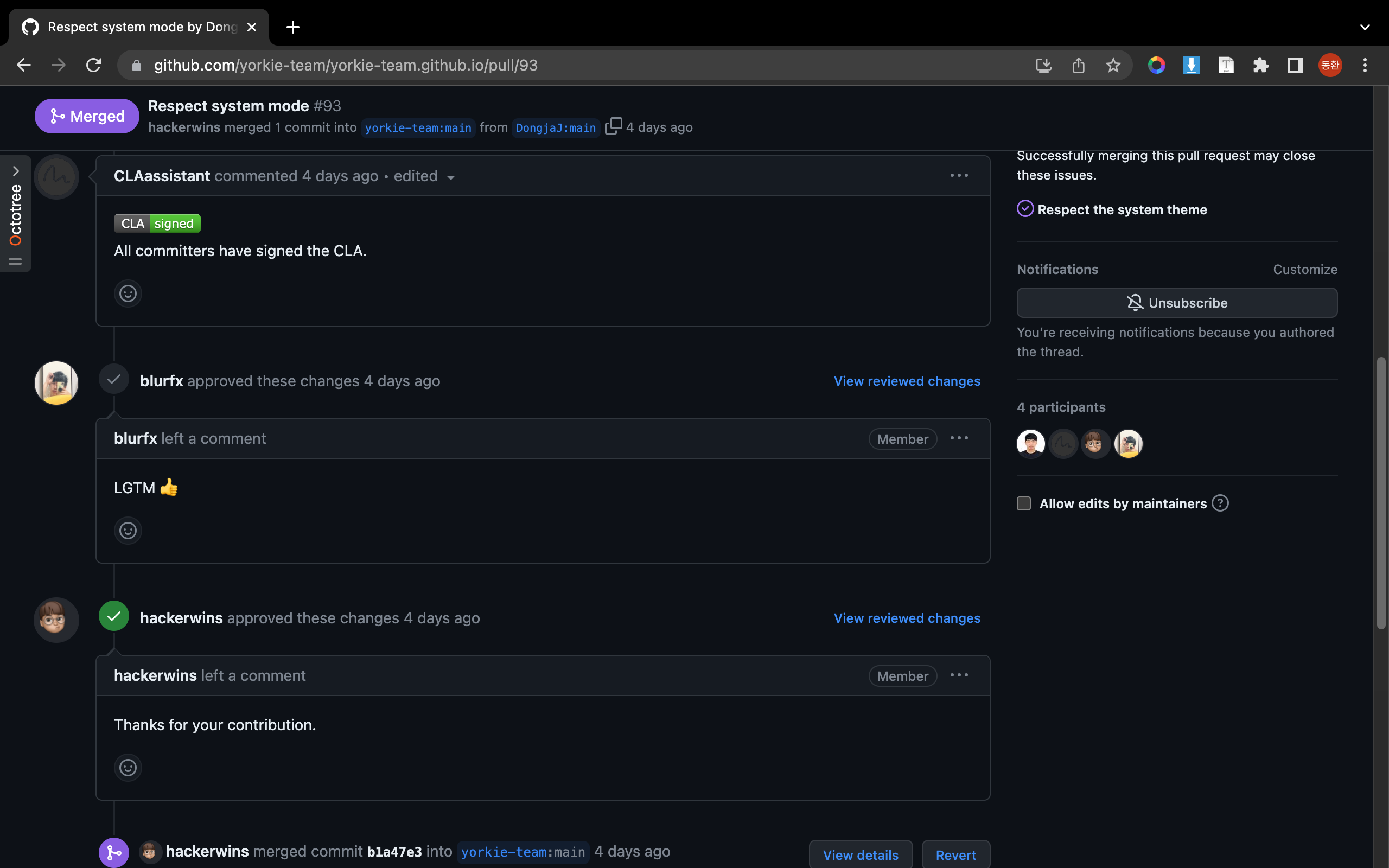 멘토님 및 컨트리뷰터님이 친절하게 코드리뷰 및 머지 해주셨다.