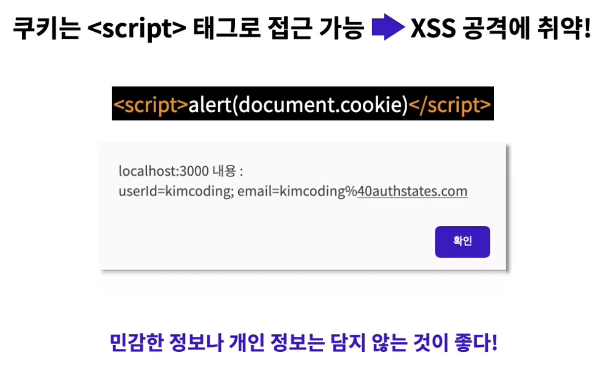 기본적으로 쿠키는 오랜 시간 동안 유지될 수 있고, 자바스크립트를 이용해서 쿠키에 접근할 수 있기 때문에 쿠키에 민감한 정보를 담는 것은 위험하다.