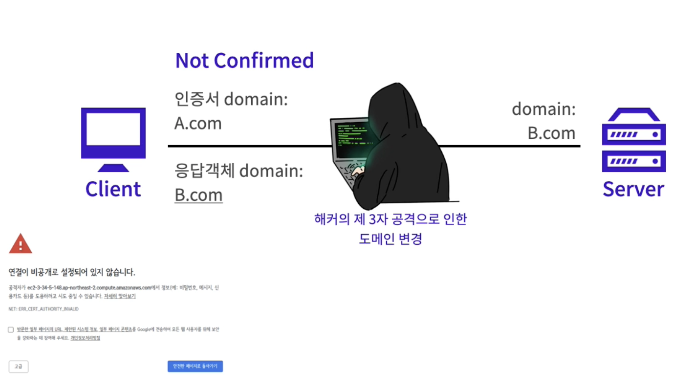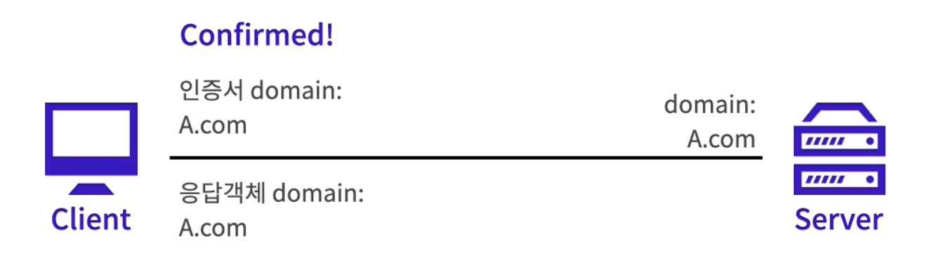 인증서에 작성된 도메인과 응답객체 도메인이 같지 않으면 데이터를 보내준 서버가 확실하다고 보장할 수 없게 된다.
