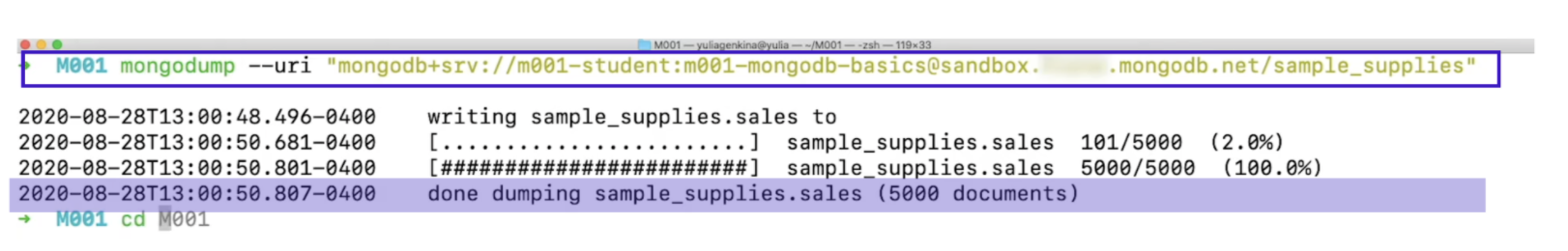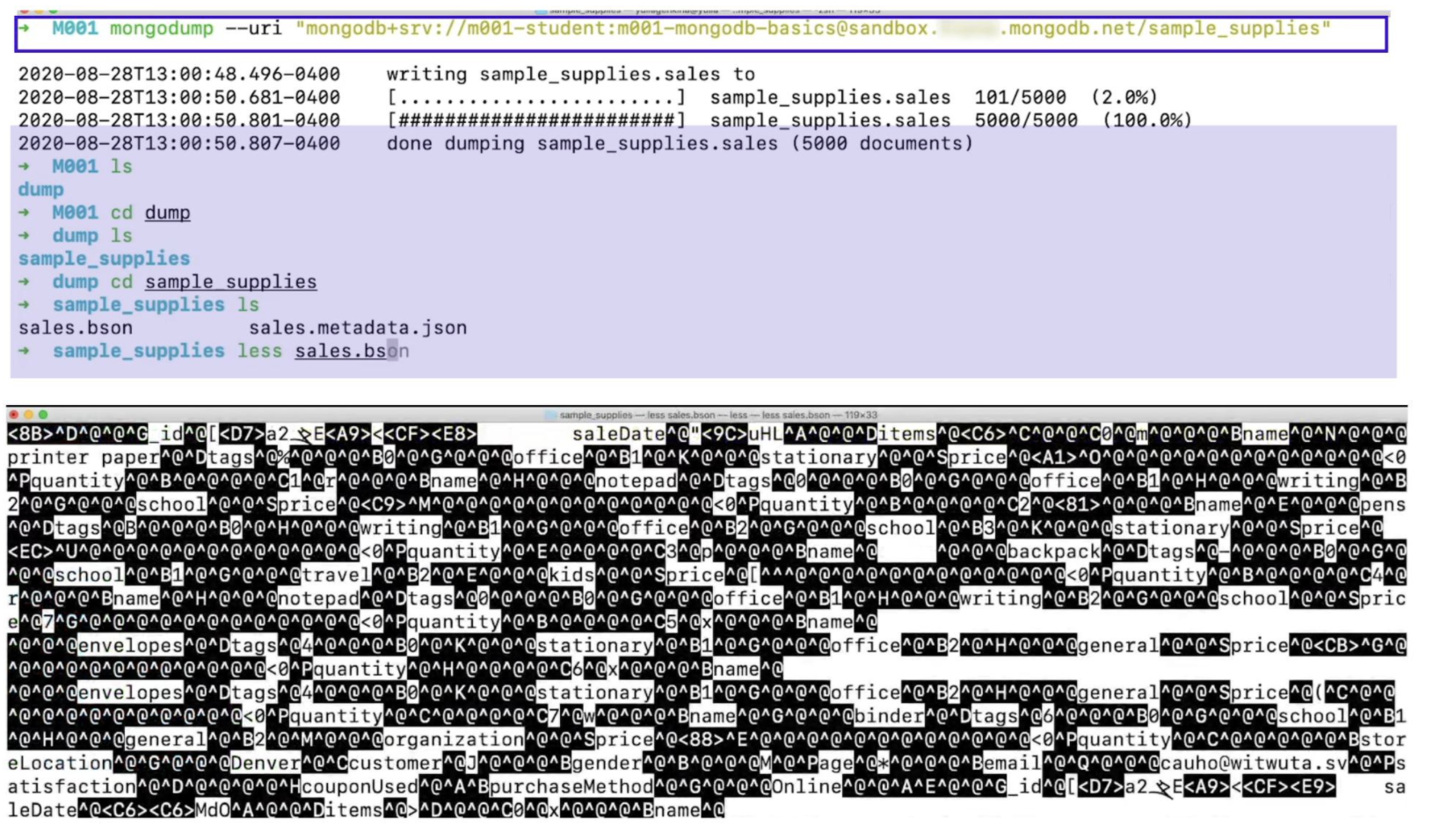 mongodump 명령어를 통해 아틀라스 클러스터 안에 있는 sample_supplies 라는 데이터베이스를 로컬 머신으로 BSON 형식의 데이터로 내보냈다.