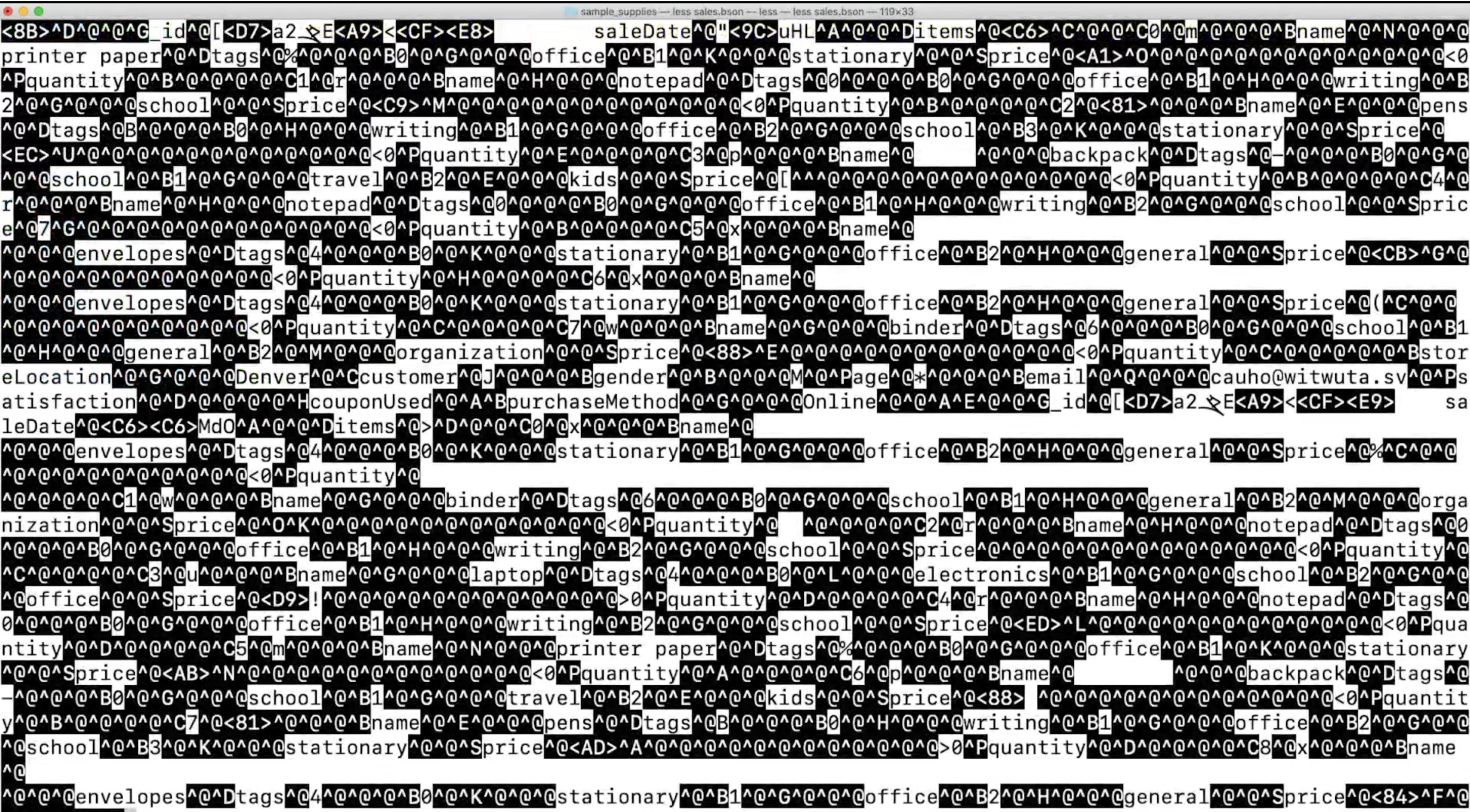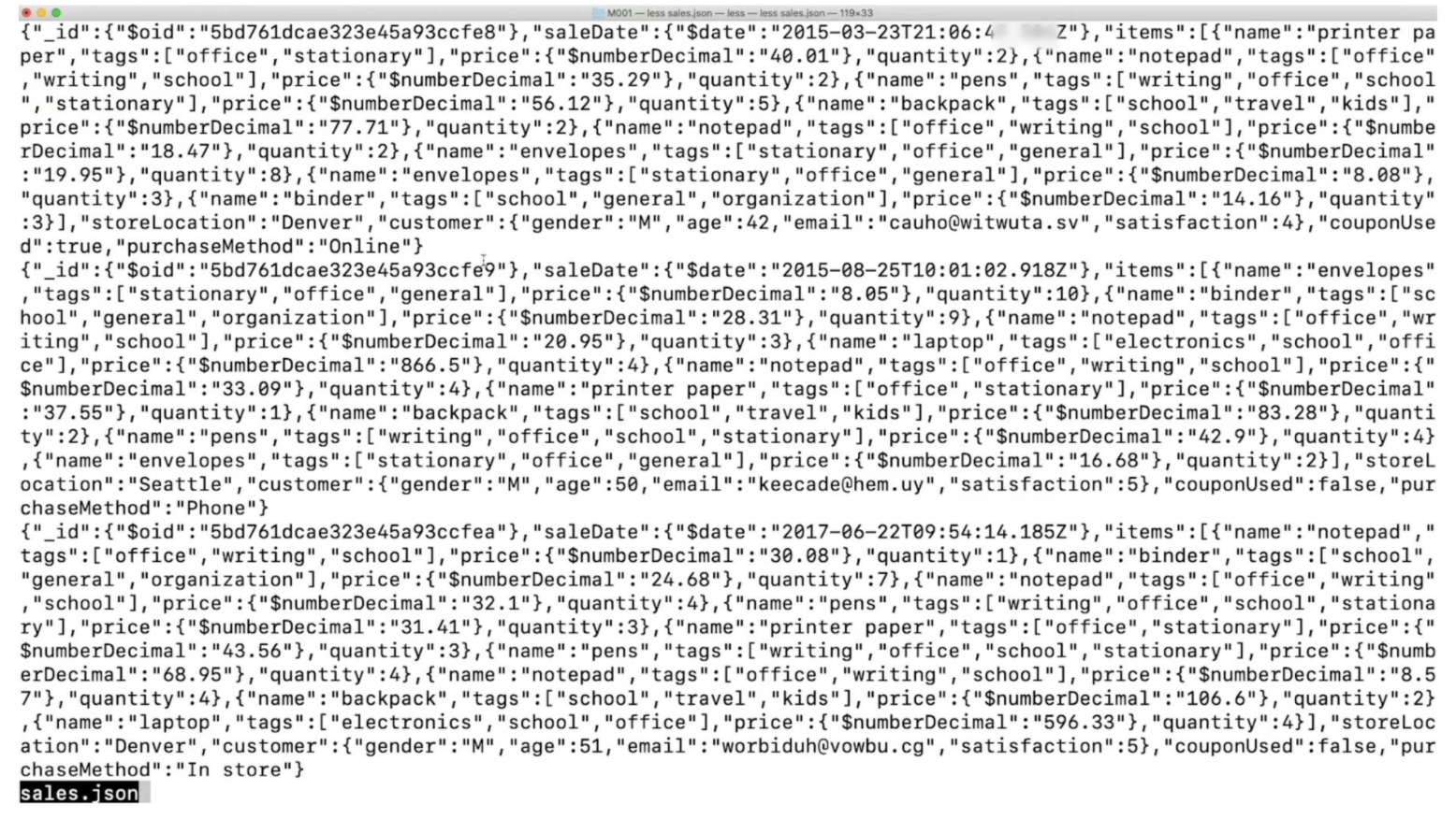 sales.bson이라는 파일을 열어보면 읽기 어려운 BSON형식의 데이터를 확인 할 수 있다.