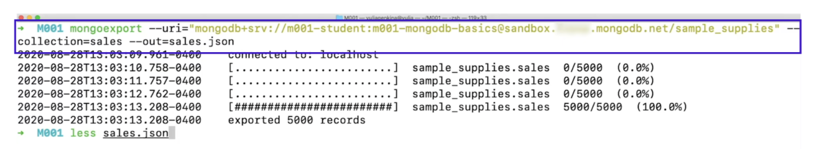mongoexport를 하는 경우에는 해당 데이터베이스의 컬렉션 이름, 파일 이름까지 정확하게 작성해줘야 한다.