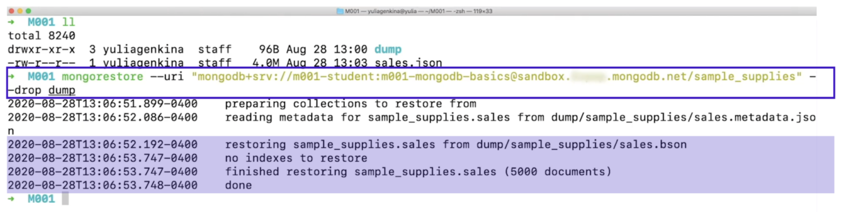 터미널에서 확인 할 수 있듯이 dump라는 폴더 안에 sample_supplies 데이터베이스 폴더가 생성되었고, 그 안에는 다시 sales.bson 파일이 생긴 것을 볼 수 있다.