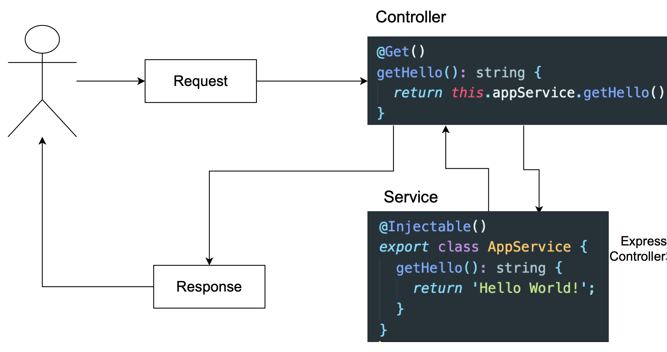 위에 보면 Controller에서 this.appService.getHello(); 이런식으로 Service에 정의해놓은 메소드를 Controller에서 가져와 쓰는 걸 볼 수 있다.