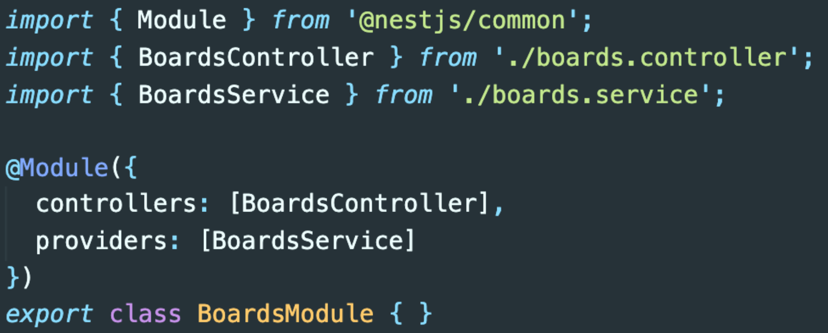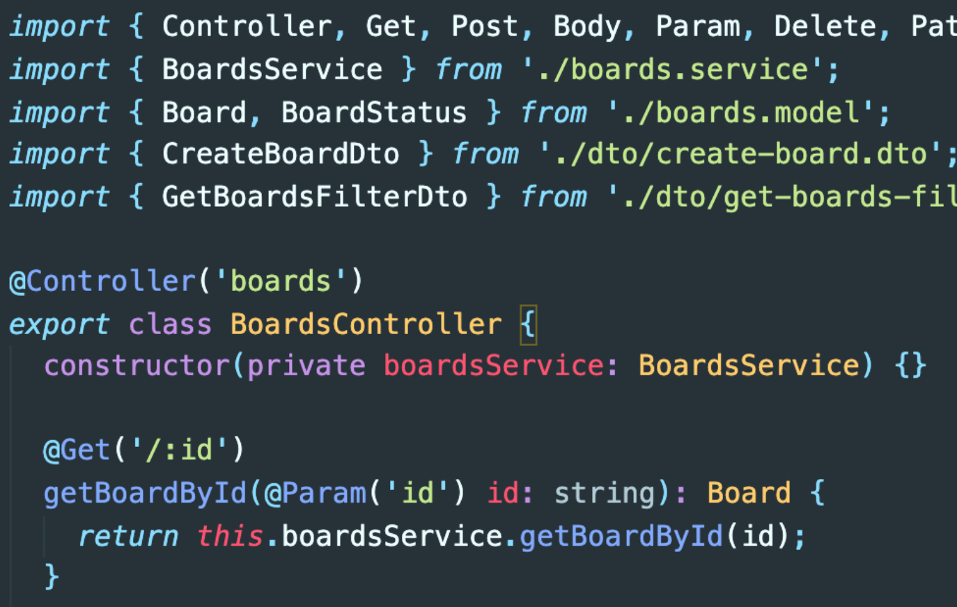 이렇게 해서 boardsService를 정의해서 Controller안에서 사용할 수 있게 만들었는데 이렇게 할 수 있는 이유는 타입스크립트의 기능을 이용해서 종속성을 타입으로 해결할 수 있기 때문이다.