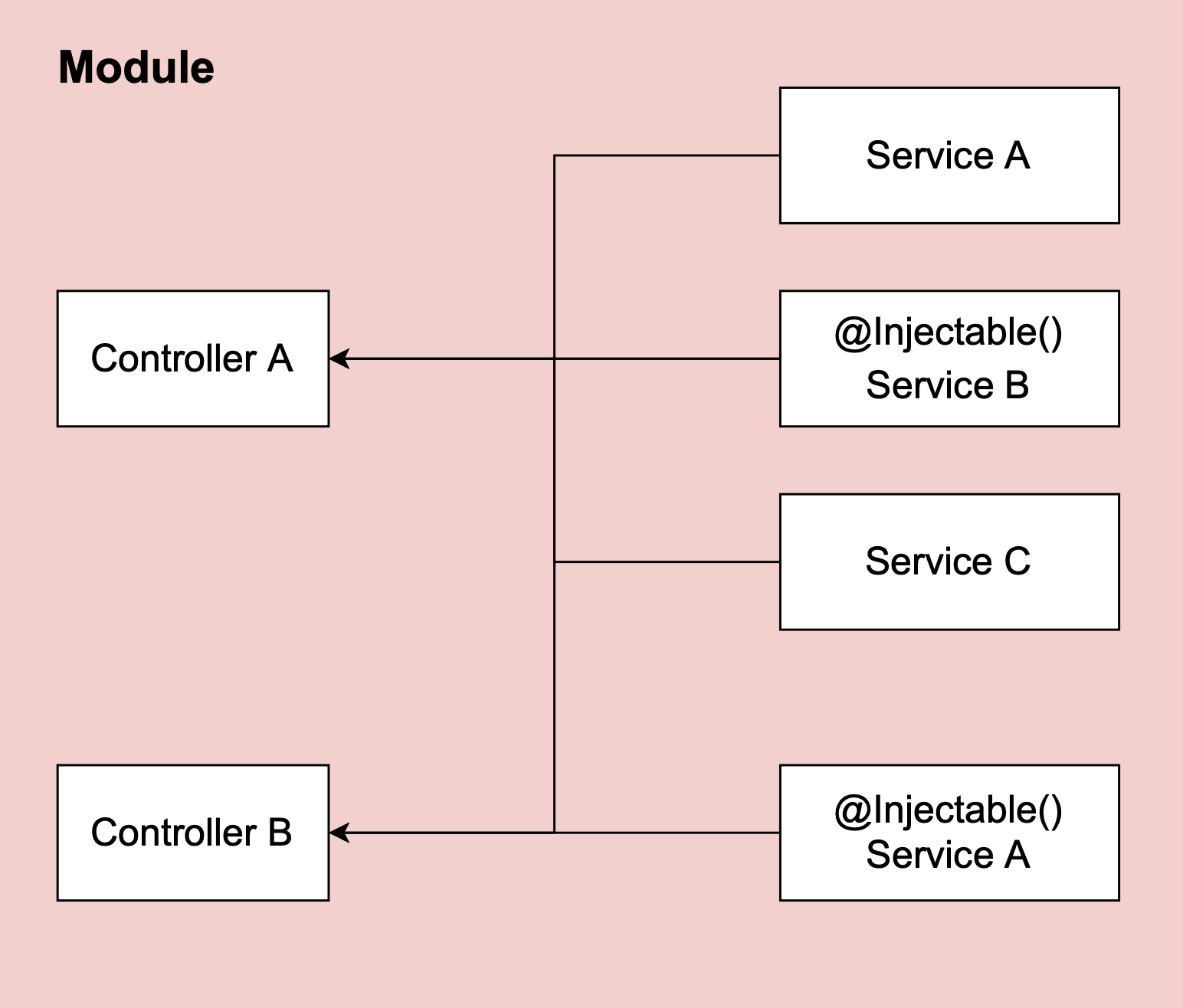@Injectable 데코레이터로 감싸져서 모듈에 제공되며, 이 서비스 인스턴스는 애플리케이션 전체에서 사용될 수 있다.