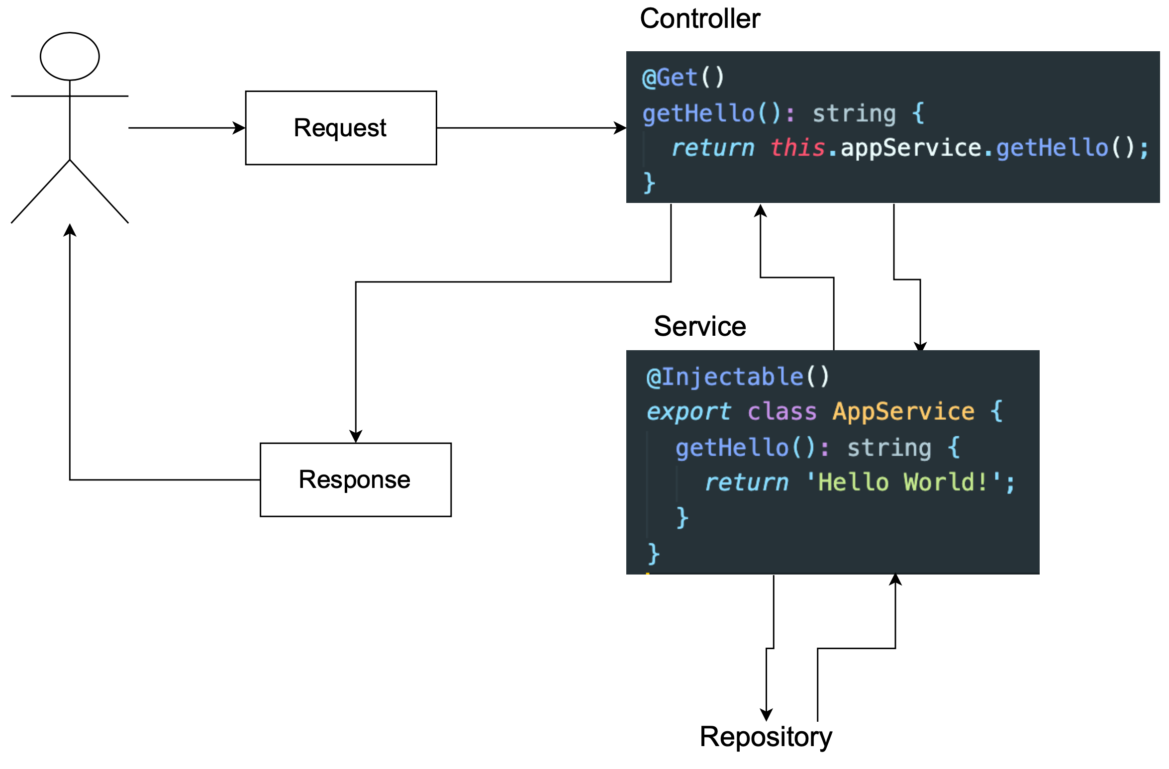 - TypeORM은 Repository Design Pattern을 지원하여 각 항목에 Repository가 존재하며, Repository는 Service와 Database 사이의 중개자 역할을 한다.