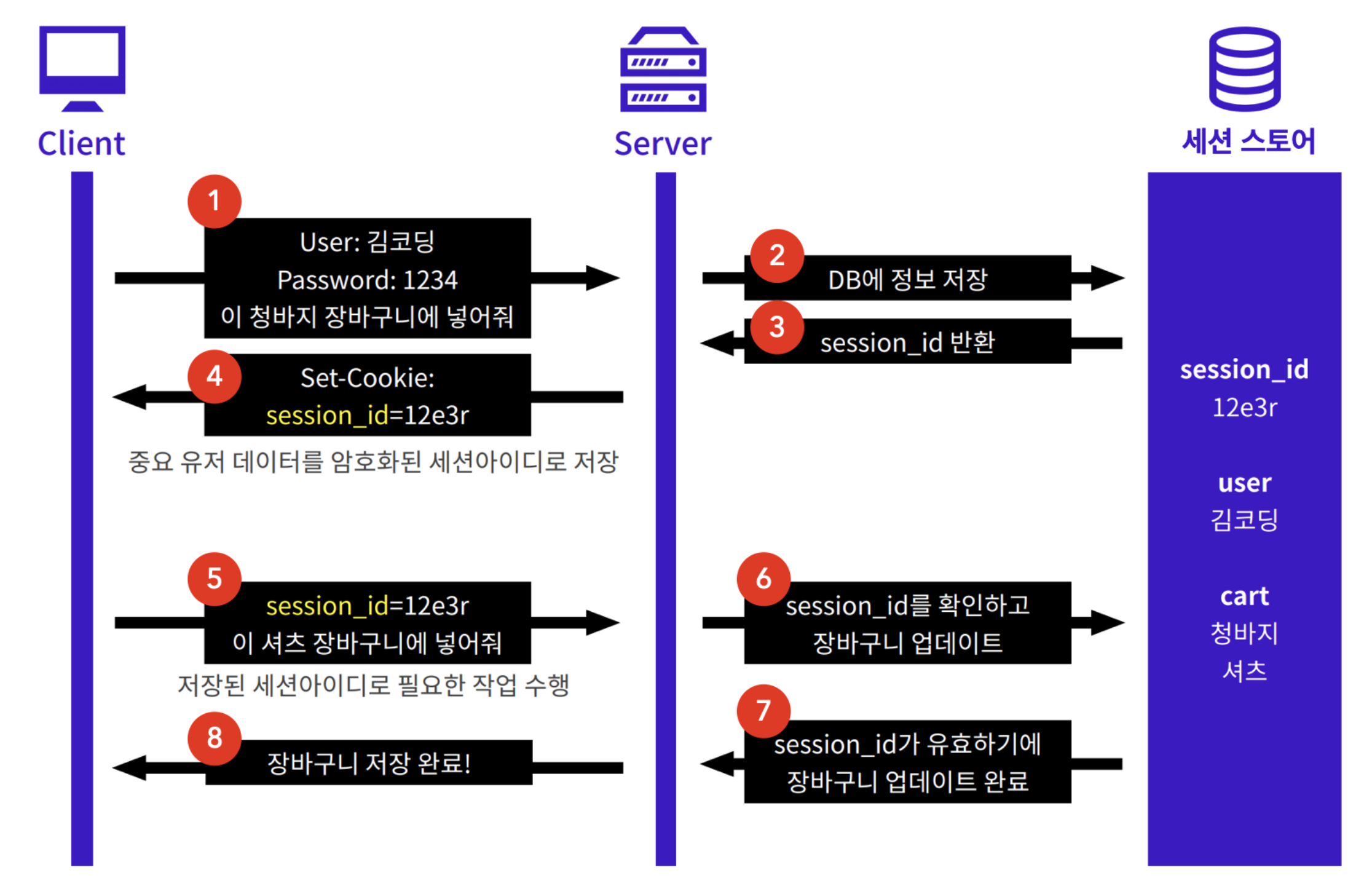 세션이 만들어지면 각 세션을 구분할 수 있는 세션 아이디도 만들어지는데, 보통 클라이언트에 세션 성공을 증명할 수단으로서 세션 아이디를 전달한다.