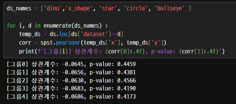 pearsonr() 메서드의 결과값 중 첫번쨰 값이 상관계수가 되고, 두번째 값이 유의수준 p-value가 된다.