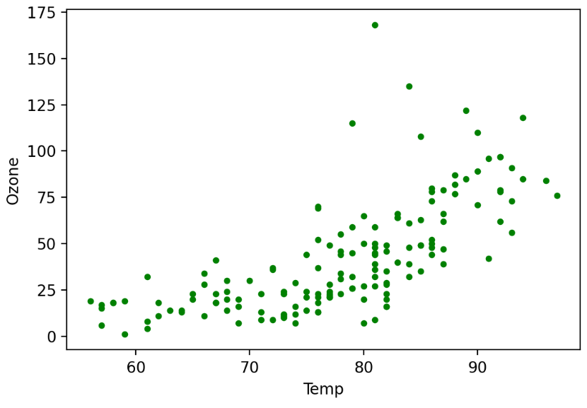 plt.scatter(x='Temp', y='Ozone', data=air, s=10, c='g')