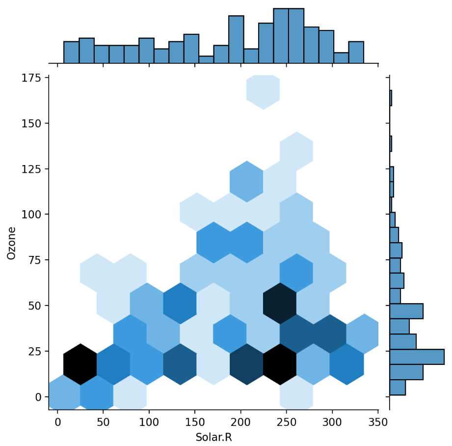 sns.jointplot(x='Solar.R', y='Ozone', data=air, kind='hex', marginal_kws=dict(bins=20))