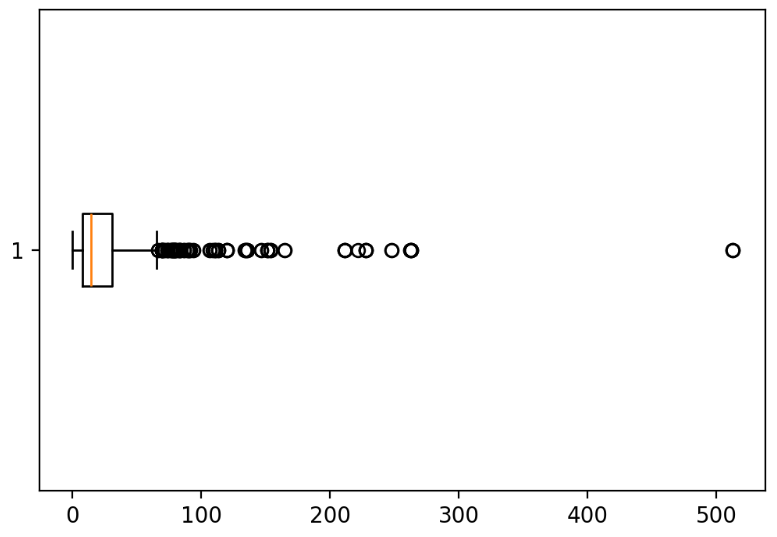 plt.boxplot(x='Fare', data=titanic, vert=False)