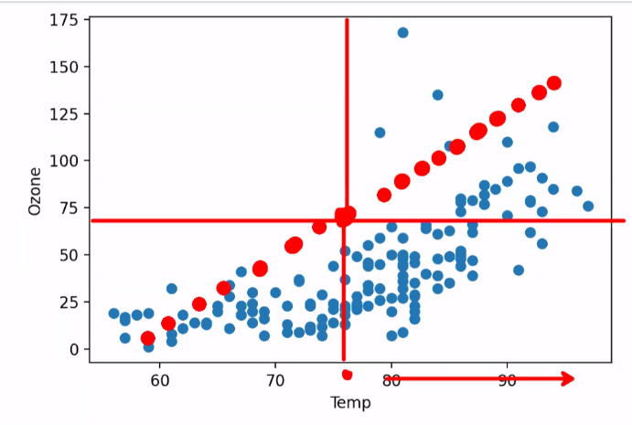 가운데 점에 대해서 오른쪽 아래의 위치한 데이터들은 강한 상관관계를 유지하지 않는다.