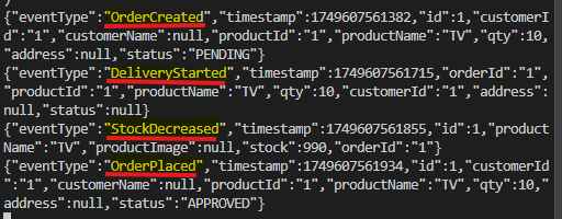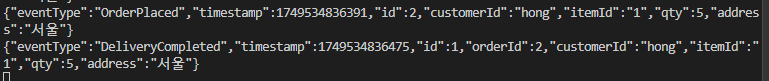 주문이 잘 생성되고, 배달되고, 재고가 감소하고, orderplaced 가 생성됨