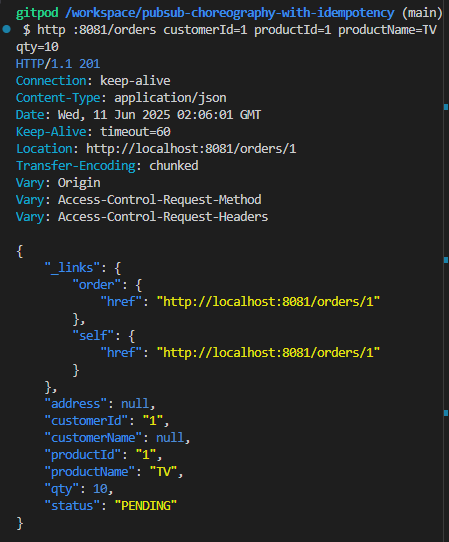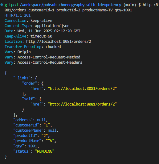 http :8081/orders customerId=1 productId=2 productName=TV qty=200