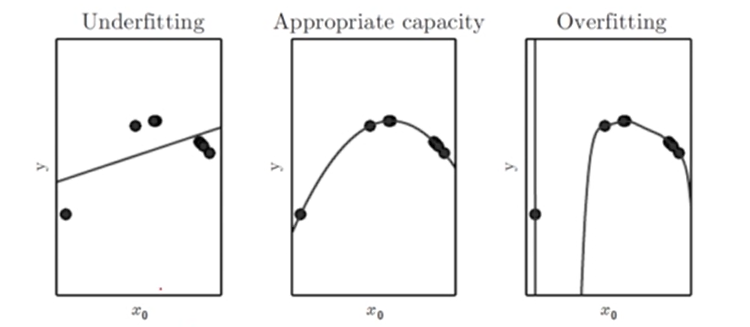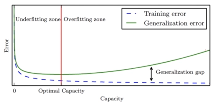 capacity와 training error의 관계를 표현한 그래프이다. 목표는 일반화 error를 최소화하는 것으로 녹색의 실선이 최적의 capacity를 지점을 찾아야 한다.