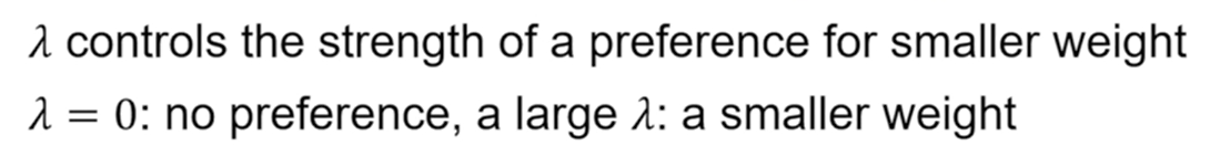 training loss가 최소화되는 방향의 W에 regularization term을 부여하여 과적합에 빠질 경우를 보완한다. 함수는 낮은 차수의 함수를 사용하는 것이 더 좋기 때문에 이를 더 선호한다.