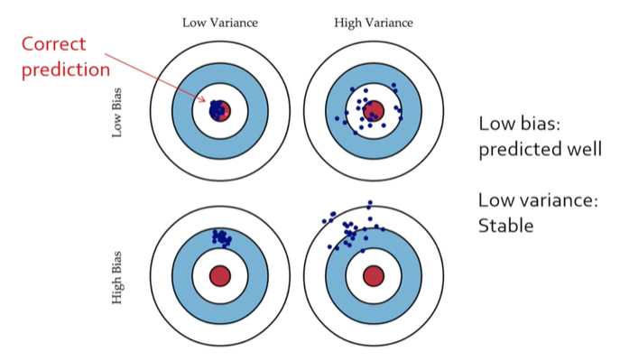 bias가 높은 것은 영점이 맞지 않은 것으로 별로 정확하지 않는 모델로 underfitting과 관련이 있는 것을 의미한다.