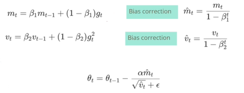Gradient의 1차원적인 모멘텀인 와 2차원적인 모멘텀 을 동시에 사용하고 bias correction을 사용해서 약간의 편향을 조정하고 1차원 모멘텀에서 2차원 모멘텀을 나누어 현재 나아가야 하는 방향을 정한다.