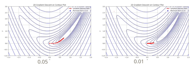 함수값에 대한 등고선은 등고선에 수직한 방향으로 이동하는 것이 gradient가 빠르게 감소하는 것이다. (0,0)에서 출발하여 대략 최소값이 (1.5, 1.5)로 이동하는 경우에서의 learning rate값이 각각 0.05와 0.01인 경우이다. 왼쪽의 경우 learning rate를 0.05로 큰 값을 부여한 경우이고, 오른쪽은 learning rate를 작은 값을 부여해 비슷한 방향으로 이동하지만 시간이 오래걸린다.