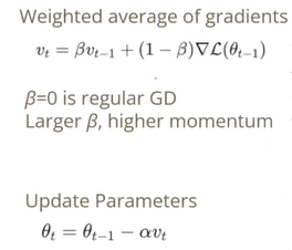 베타를 0과1 사이의 값으로 하였을 때, 현재 위치에서의 gradient와 지금까지의 gradient의 총합에 선형결합으로 나타낸다. 에는 전전 gradient들이 가중된 합으로 들어가 있다.