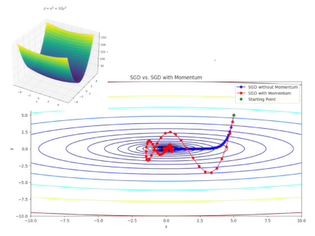매 지점에서 가장 가파른 방향으로 나아가는 것이 아니라 산등성이에서 공을 굴리는 것과 같은 공의 관성을 부여하여 오르락 내리락하면서 수렴하는 경우이다.