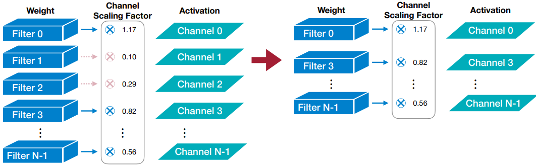 각 채널마다 scaling factor를 통해, importance를 학습하고, scaling factor값이 작은 채널을 pruning하는 방식이다.