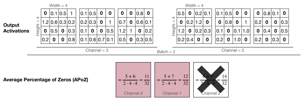 output에서 0이 가장 많은 채널을 pruning하는 방법이다.