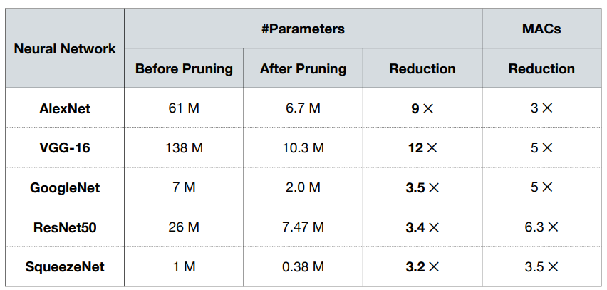 - 여기서 vgg-16은 파라미터가 12배나 줄었지만, 연산량은 5배만 줄었고, resnet50은 파라미터가 3.4배 줄었지만, 연산량은 6.3배나 줄었다. 이는 네트워크 구조때문인데, vgg-16은 fc layer가 3개 있고 (약 17%), resnet50은 fc layer가 1개만 있다 (1% 미만). fc layer는 sparsity가 어렵기 때문에 fc layer에서의 pruning을 연산량 감소에 많은 영향을 끼치지 못한다.