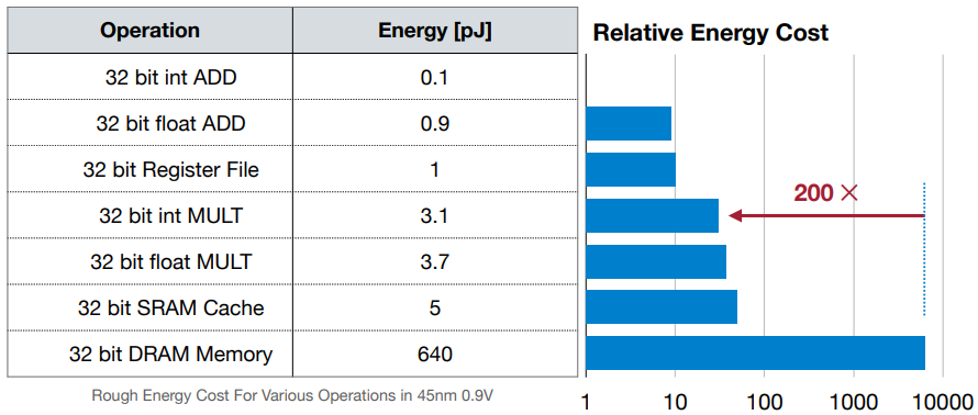 - 사칙연산에 비해 메모리 이동에서의 전력 소모량이 매우 높은 것을 확인할 수 있다. 이는 모델 추론에서도 큰 영향을 미친다. gpu 병렬 연산을 생각하면 한번에 병렬처리 된다고 생각하기 쉽지만, 사실은 gpu core가 바로 사용할 수 있는 메모리 영역은 크지 않아서, 한 layer의 가중치나 feature map이 모두 로드되지 못할 수 있다. 따라서 순차적으로 가중치와 feature map을 로드하여 병렬처리하게 되는 것이다.