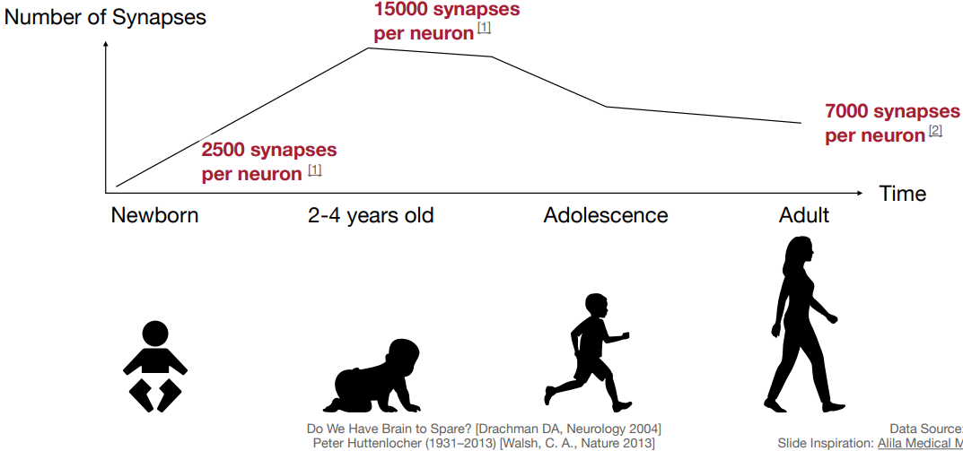 이 과정은 인간의 뇌에서 자연적으로 이루어진다. 2~4살일 때보다 성인인 지금에 시냅스는 21로 줄었고, 이는 퇴화가 아닌 필요한 시냅스만 유지되게 된 것이다. 이 개념을 모델에도 적용할 수 있다.