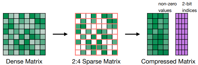 - 2:4 sparse matrix를 compressed matrix로 표현하면서, 가중치 값 + 위치 정보를 별도로 저장해야하기 때문에 가중치 메모리는 딱 절반으로 줄 순 없다.