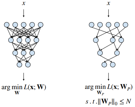 원래 네트워크의 목표는 손실함수를 최소로 하는 W를 찾는 것이다. pruning된 네트워크에서도 손실함수를 최소화 하는 Wp를 찾는 것이다. 이때, Wp 중 0이 아닌 파라미터의 수를 N보다 적게 한다는 제약사항이 있다. 즉, loss는 기존과 같이 낮추면서, 0인 파라미터의 수를 설정하는 것이다.
